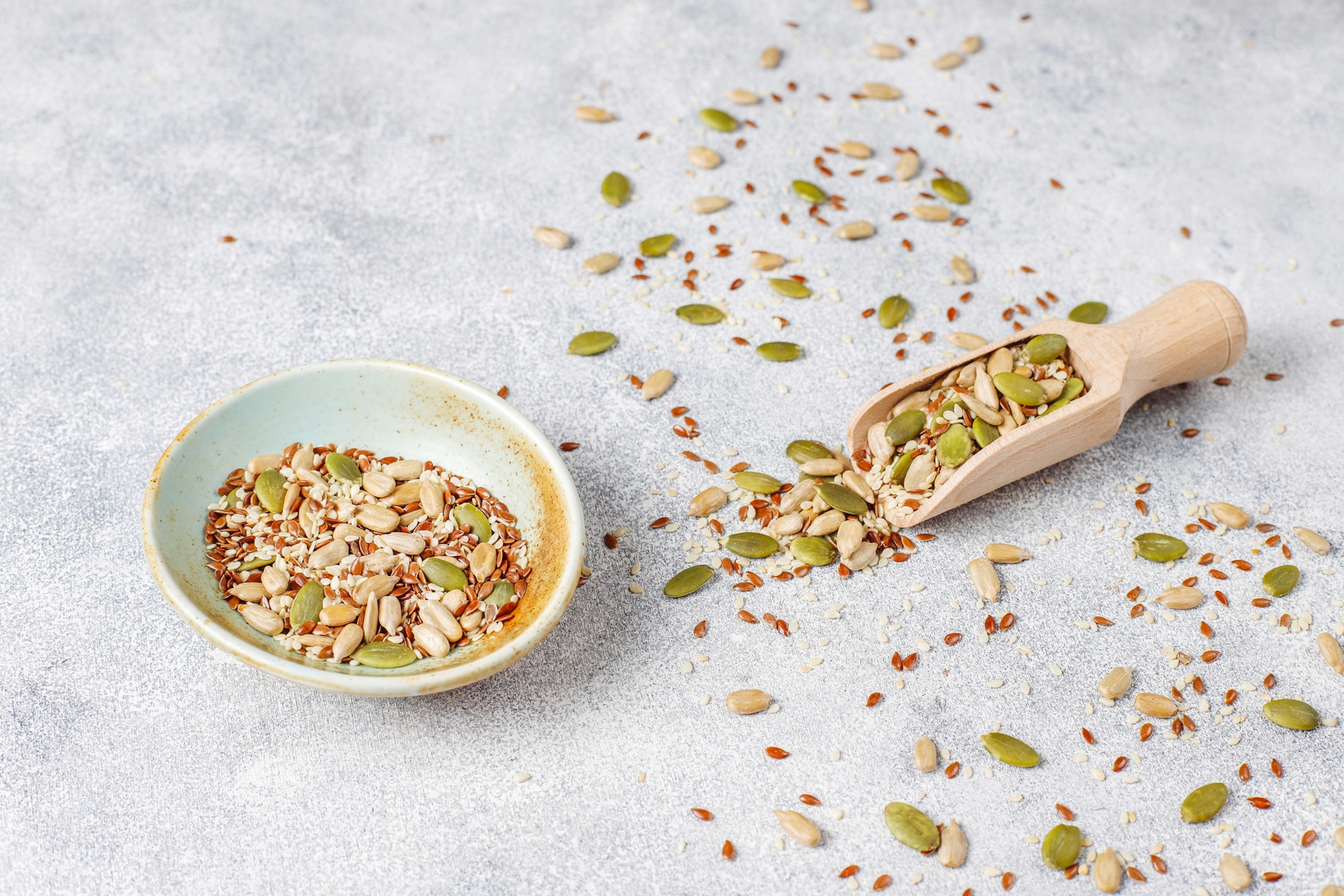 Las semillas de calabaza son una excelente fuente de zinc, relacionado con el bienestar prostático y hormonal. Linaza y semillas de girasol aportan ácidos grasos omega-3 que favorecen la circulación y la salud cardiovascular.